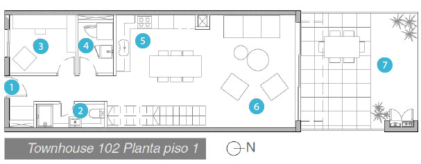 Townhouse 102 en piso 1: Vista patio, living y cocina